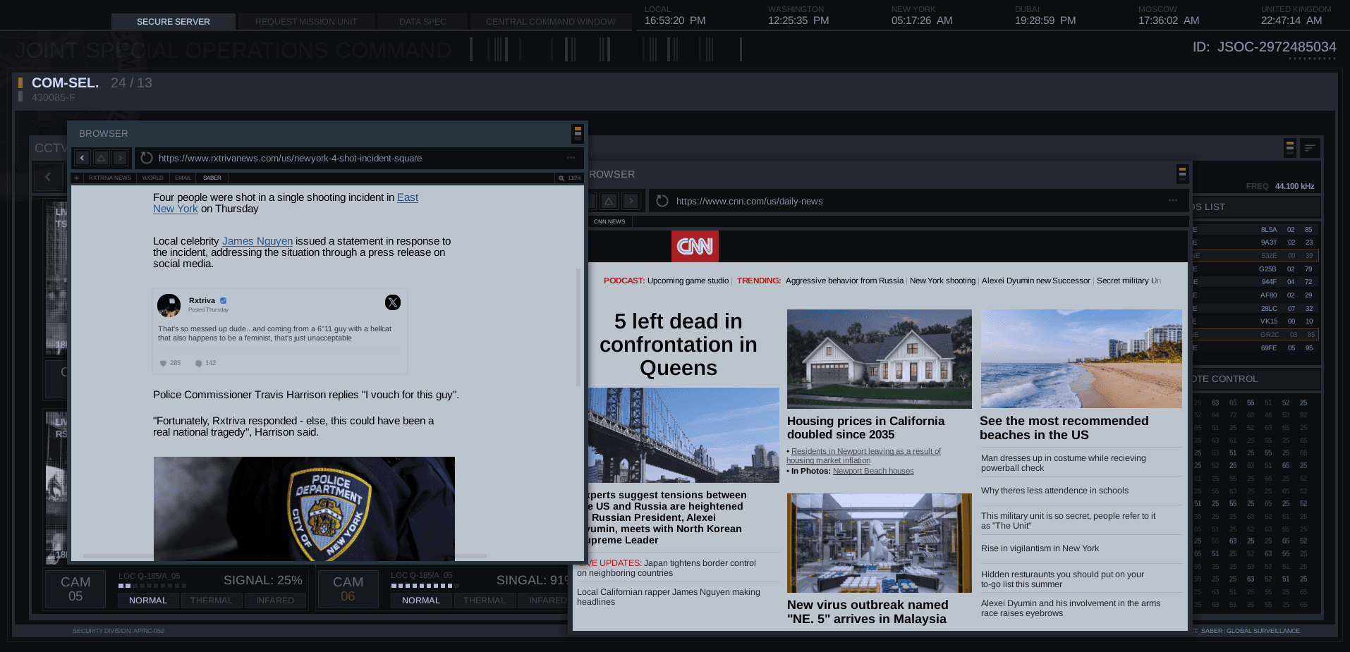 To create the Fictional User Interface (FUI) for EXFIL, I conducted in-depth research by analyzing real-world websites, military systems, and professional UI designs. This involved studying layout structures, typography, and interactive elements commonly found in real-world applications. By referencing these sources, I was able to create an iteration that balances realism with cinematic aesthetics. The design process focused on intricate detailing, ensuring it could be animated smoothly and effectively integrated into a short film.